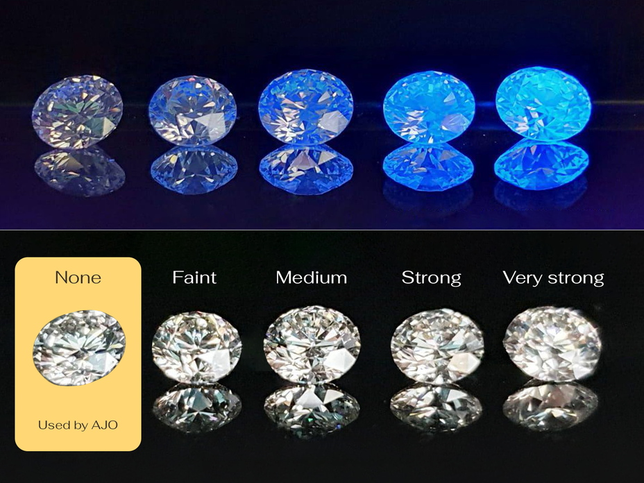 We require zero fluorescence in all diamonds used in our jewelry. By using diamonds with no fluorescence, we ensure a cleaner, brighter appearance in all lighting conditions.